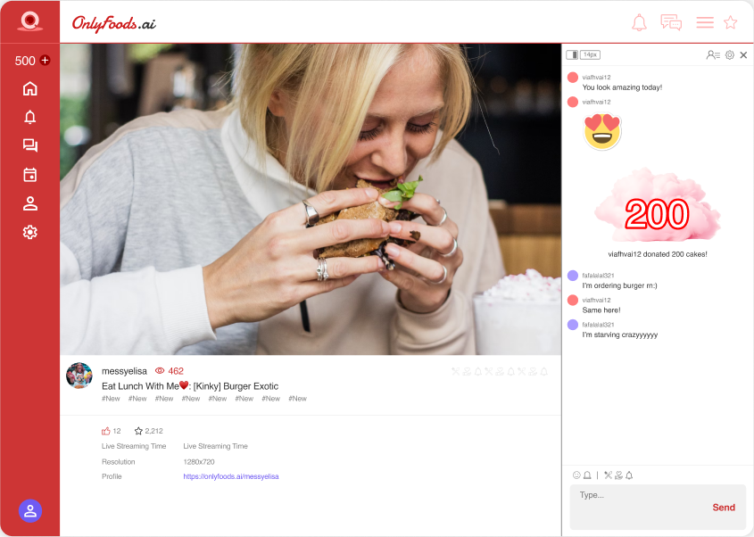 Your fans crave more than just glimpses of your life. On OnlyFoods.ai, stream live, sharing your meals and stories, while engaging through interactive chats. Experience the joy of live donations as you dine, knowing every bite brings you closer to your audience.